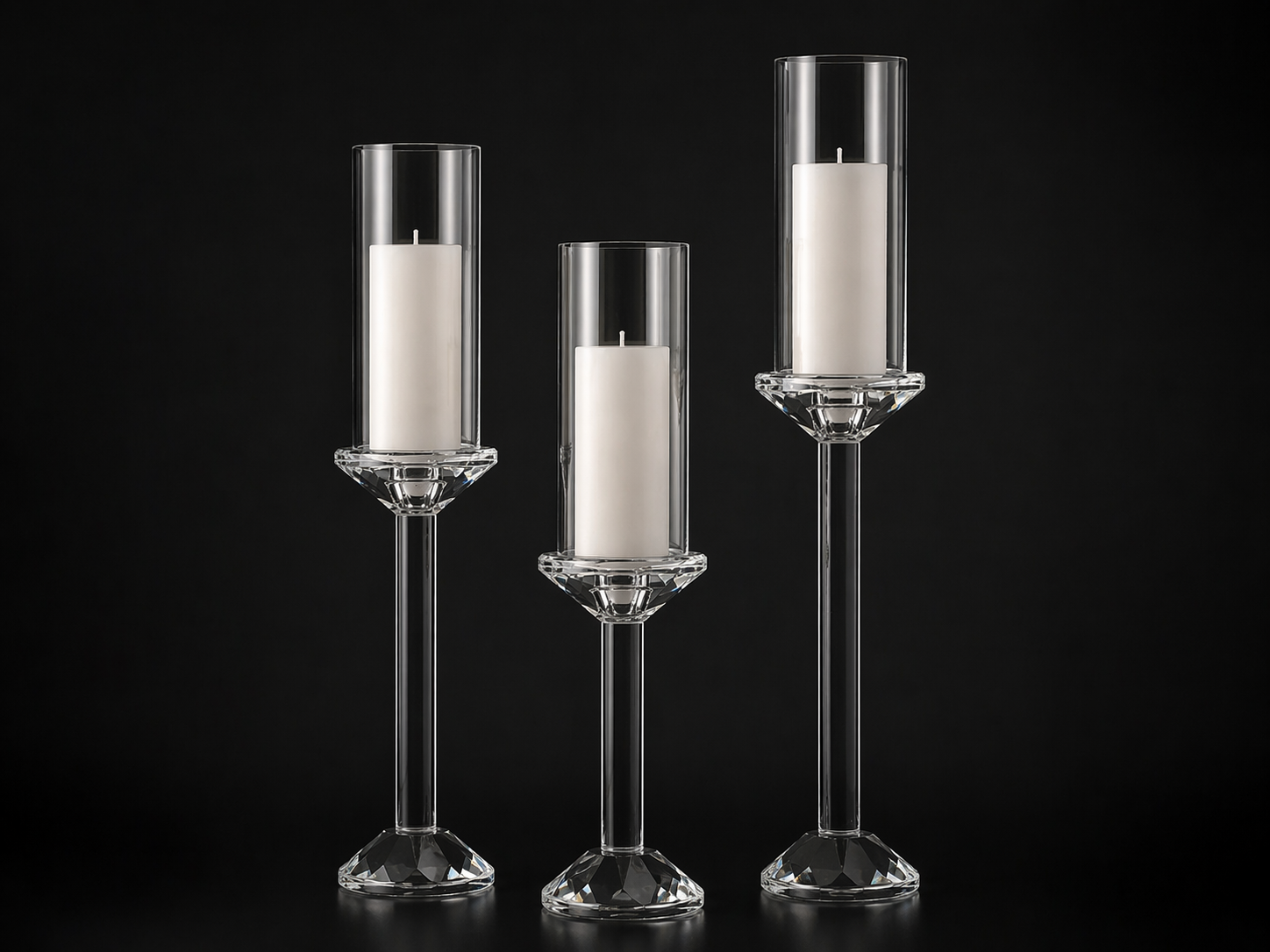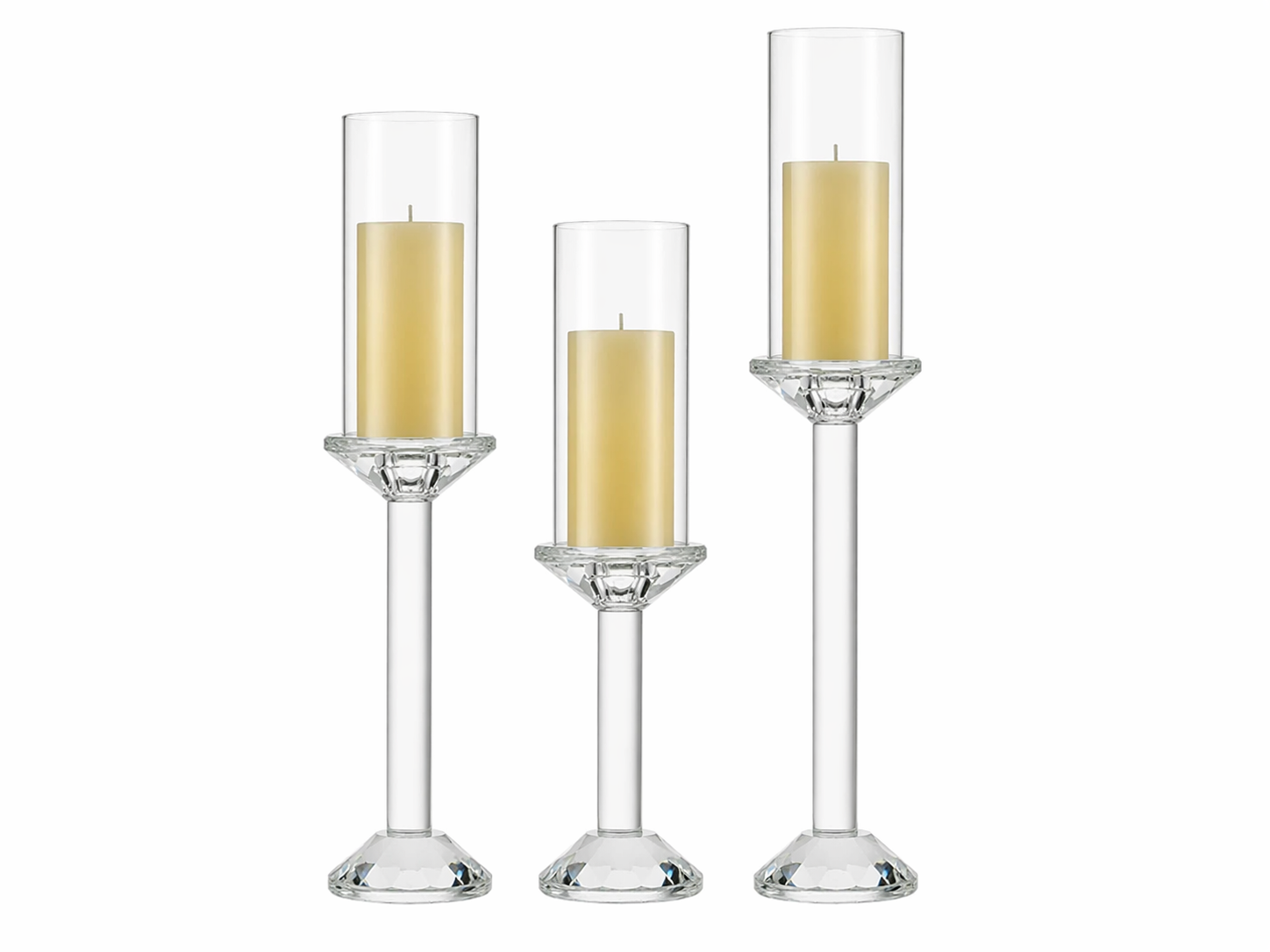 Szklane świeczniki dekoracyjne – zestaw 3 sztuk na świece grube i cienkie to elegancka i ponadczasowa dekoracja, która doskonale sprawdzi się w aranżacjach weselnych, bankietowych oraz we wnętrzach restauracyjnych i hotelowych. Transparentna forma oraz smukła sylwetka sprawiają, że świeczniki pięknie eksponują światło świec, tworząc przytulny i wyjątkowy klimat.